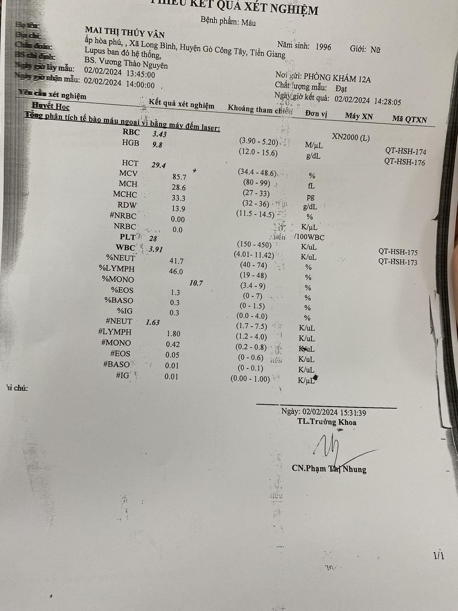 | 26/08/2025 | 178 | 11.29 | 76 | 5.475 | 4.33 | 39.7 | - Xét nghiệm diamond | |